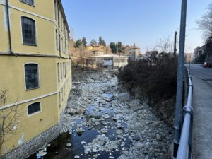 Insieme all'esperta locale e artista Annalisa Zegna, Joshua ha poi esplorato diverse località lungo il torrente Cervo e il fiume Sesia, visitando i punti più interessanti dal punto di vista geologico, geomorfologico, storico e idrografico. Ha inoltre potuto documentarsi sull'eredità dell'industria tessile biellese visitando l’archivio del DocBi Centro Studi Biellese alla Fabbrica della Ruota di Pray. Qui ha incontrato Danilo Craveia, archivista responsabile di molti archivi storici del Biellese ed esperto di documentazione relativa ai vari usi dell'acqua dal punto di vista storico e culturale. Joshua ha anche incontrato Enrico Rivella, esperto del Dipartimento Nord Ovest di Arpa Piemonte, che gli ha permesso di investigare il sistema di canali artificiali per l'irrigazione e come viene utilizzata l'acqua nelle risaie di Vercelli. Un’altra visita utile è stata quella all'impianto di depurazione CORDAR a Cossato, dove ha potuto esaminare il sistema di depurazione per le acque reflue attraverso i processi aerobici e anaerobici.