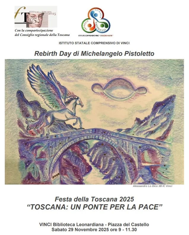 Sabato 29 novembre 2025, presso la Biblioteca Leonardiana a Vinci e in Piazza del Castello dei Conti Guidi, è stato celebrato il Giorno della Rinascita con la presentazione del progetto "Educare alla Pace: Leonardo, Picasso, Pistoletto", in sinergia con la "Festa della Toscana 2025". Tra presentazioni, testimonianze e performance del simbolo trinamico, scopriamo quanto emerso attraverso le parole dell'ambasciatrice Rebirth/Terzo Paradiso Patrizia Vezzosi.