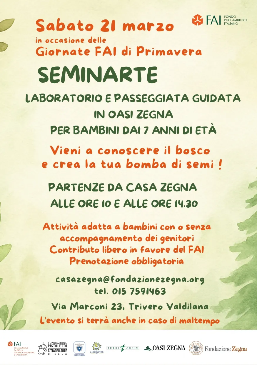Una giornata all'insegna della natura e della creatività dedicata alle nuove generazioni: il riferimento è a Seminarte, che, nomen omen, proporrà ai partecipanti un viaggio alla scoperta delle bellezze delle Alpi Biellesi con tanto di attività artistiche che porteranno alla creazioni di speciali "bombe di semi". L'iniziativa, in programma per sabato prossimo, prevede nello specifico un laboratorio e una passeggiata guidata in Oasi Zegna per bambini dai 7 anni, con o senza l'accompagnamento dei genitori; sarà possibile prendere parte all'evento alle ore 10 o alle 14.30, sempre con partenza da Casa Zegna.