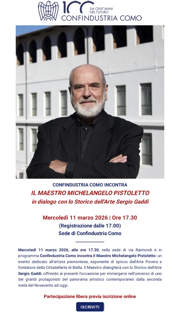 L’evento si inserisce nel programma di iniziative promosse da Confindustria Como per favorire il confronto tra il mondo dell’impresa, della cultura e dell’arte contemporanea. Il dialogo offrirà ai partecipanti l’occasione di riflettere sul ruolo dell’arte nella società e sulle possibilità di relazione tra creatività, responsabilità sociale e trasformazione dei sistemi produttivi.