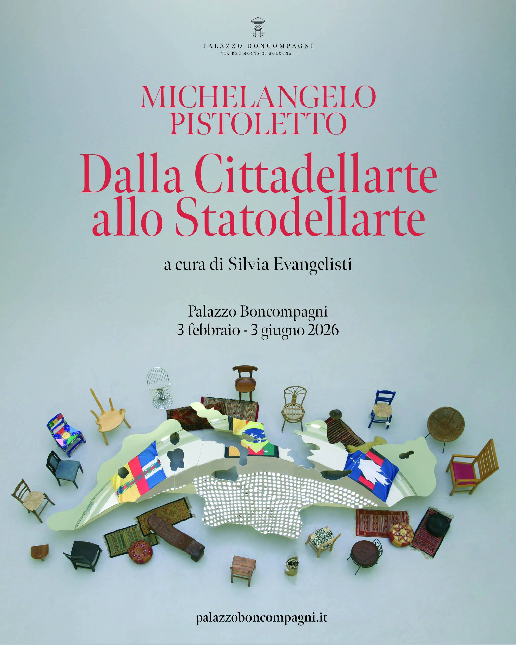 Alla vigilia dell’inaugurazione, domani 3 febbraio, Palazzo Boncompagni apre le porte alla nuova mostra del fondatore di Cittadellarte, a cura di Silvia Evangelisti. Un progetto che attraversa oltre sessant’anni di ricerca e che mette in scena l’arte come dispositivo attivo di relazione, politica e responsabilità condivisa, assumendo Cittadellarte come origine, metodo e modello operativo di trasformazione sociale.
