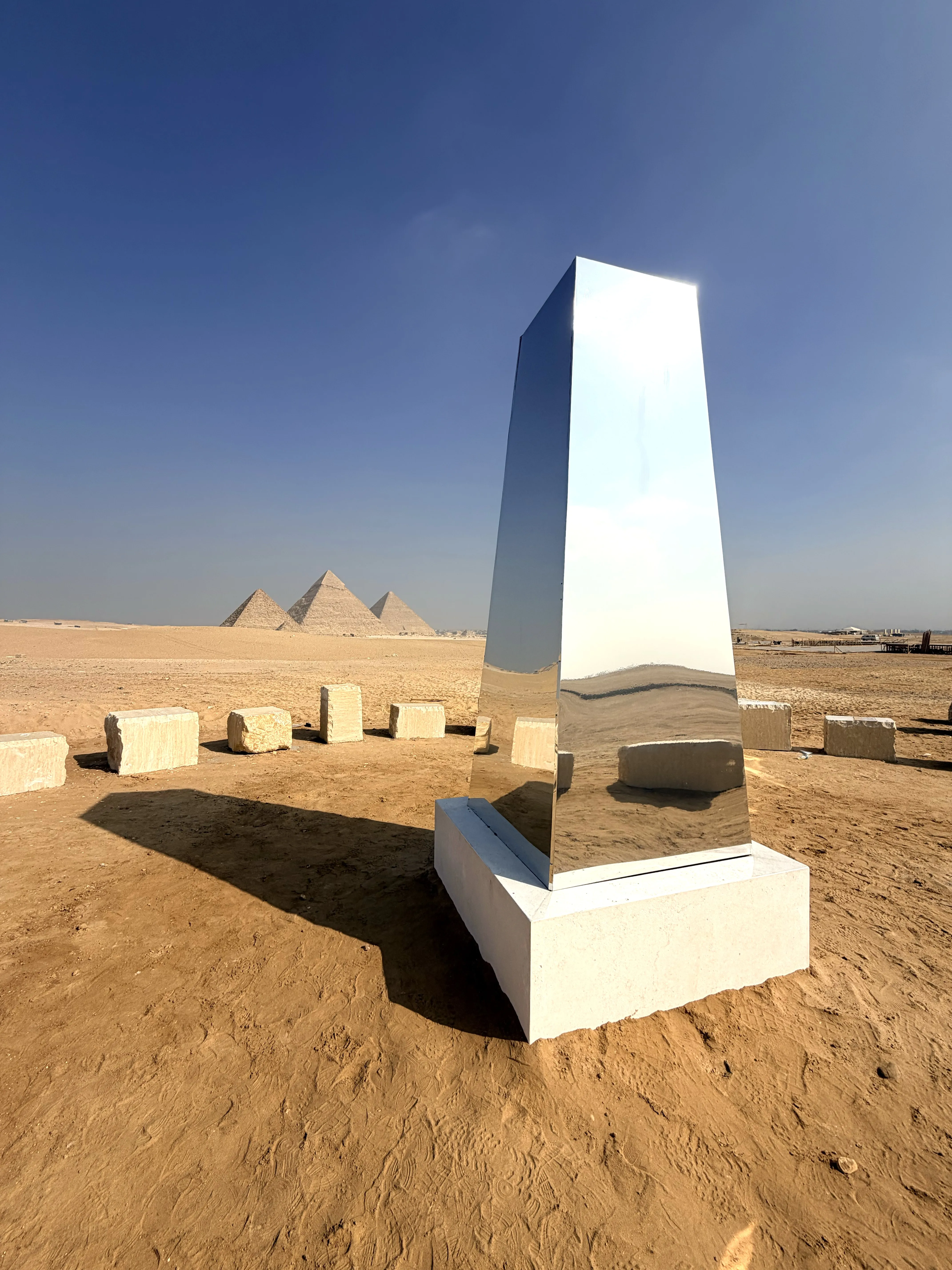 “Le piramidi sono la base, l’origine di tutta la nostra storia - spiega Michelangelo Pistoletto - che passa attraverso l’antica Roma e la Grecia e si collega persino alle questioni più urgenti del presente: il bisogno umano di guardare verso il cielo, di raggiungerlo come traguardo, pur restando radicato profondamente nella terra. Le piramidi rappresentano il desiderio di sopravvivenza dell’essere umano in termini di immortalità che diventa poi l’icona specchiante che ho creato. L’arte assume così una dimensione che trascende il tempo e oggi rinasce attraverso la formula trinamica del Terzo Paradiso, che conduce alla terza fase dell’umanità, una fase che trae conclusioni da tutto ciò che è accaduto finora per poter ricominciare. Abbiamo il passato da un lato, in uno dei cerchi della trinamica; il futuro nel cerchio opposto; e la nostra condizione presente al centro, che raccoglie tutto il passato per trasformarlo in futuro e, allo stesso tempo, riconnettere il futuro al passato. Ecco perché è così importante oggi avere il simbolo trinamico della creazione collocato proprio di fronte alle piramidi: per riconnetterci con la storia e proiettarci nel futuro”.