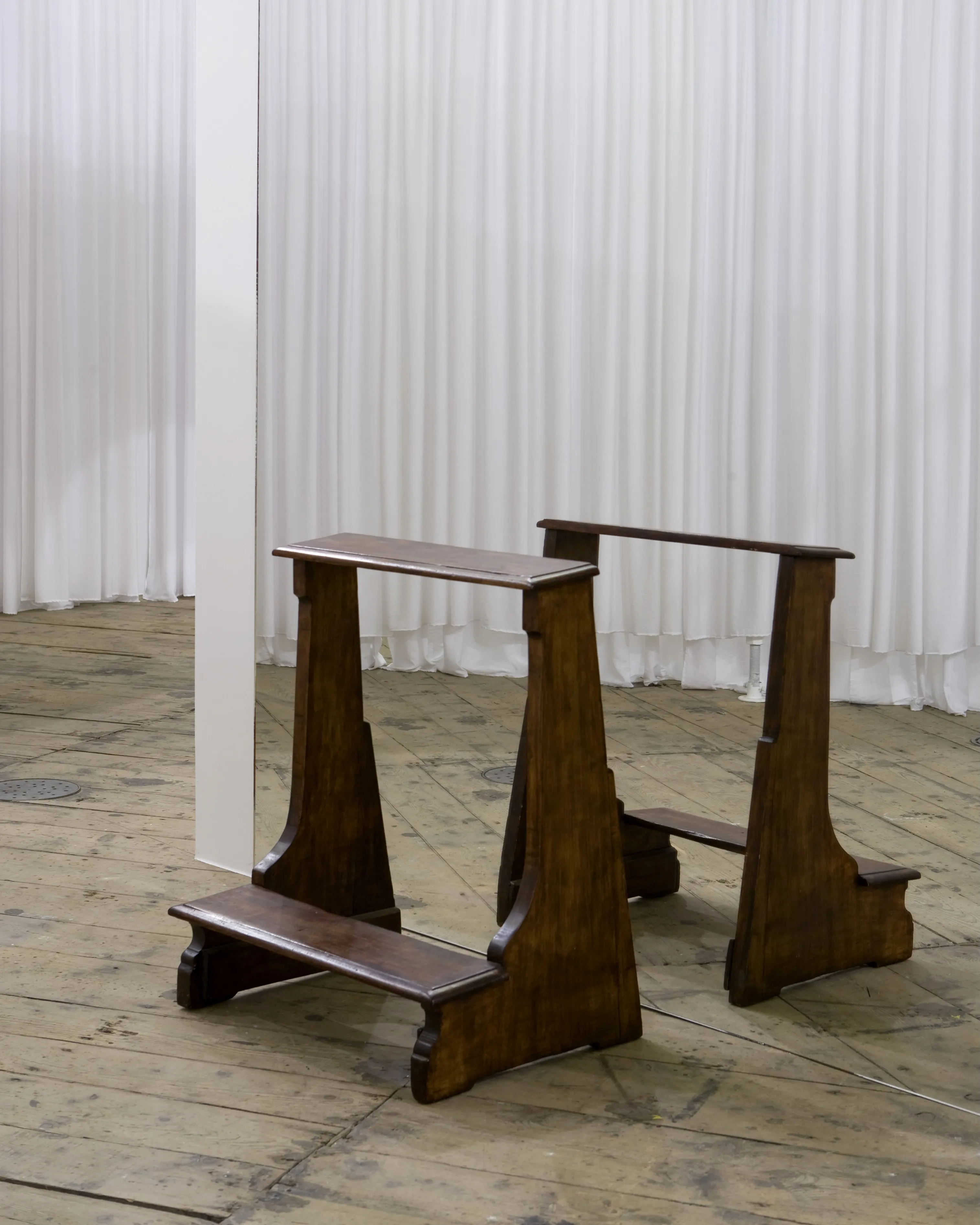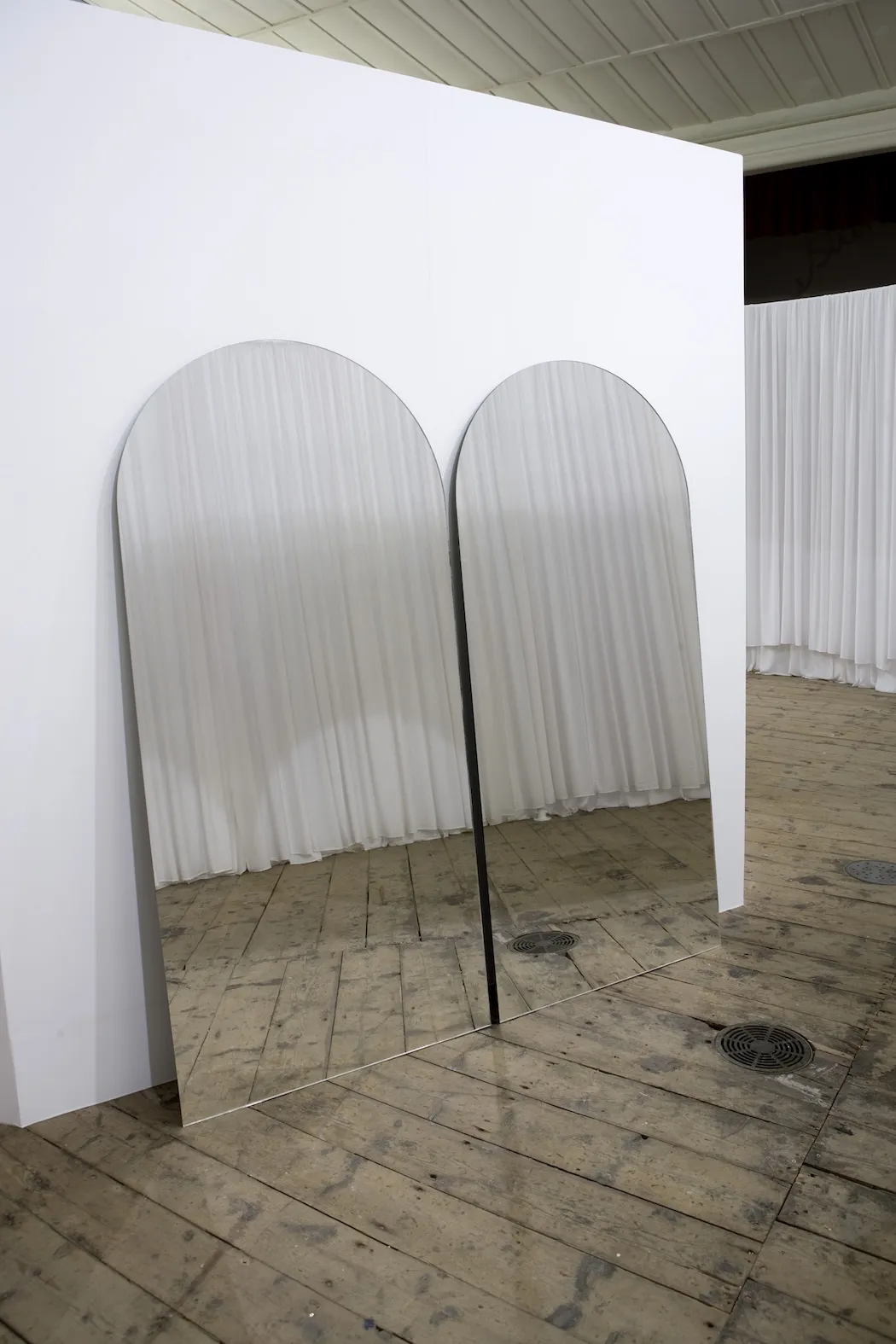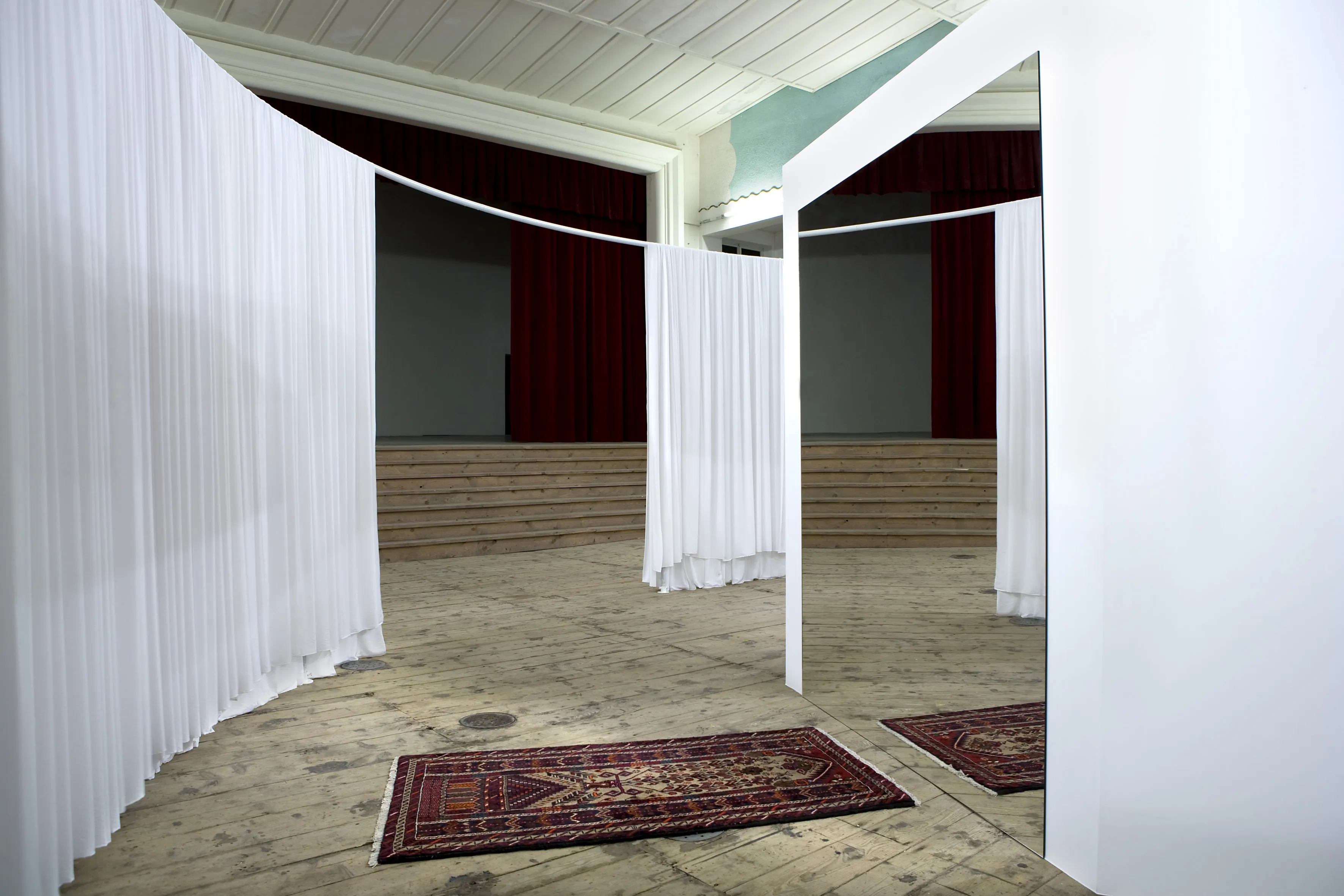 Allestita nel foyer dell’Auditorium del Palazzo regionale, Il tempo del giudizio si configura come un tempio comune e come uno spazio di soglia: un ambiente unitario in cui le principali tradizioni religiose sono chiamate a confrontarsi non sul piano dottrinale, ma attraverso un’esperienza condivisa di riflessione e rispecchiamento. Cristianesimo, Islam, Buddismo ed Ebraismo sono evocati mediante elementi simbolici collocati di fronte a superfici specchianti: un inginocchiatoio, un tappeto da preghiera, una statua del Buddha, e, per l’Ebraismo, due grandi specchi sagomati nella forma delle Tavole della Legge.