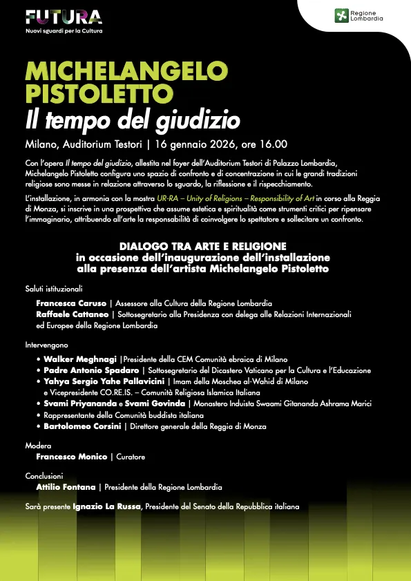 In occasione dell’inaugurazione, alla presenza dell’artista, si terrà alle ore 16.00 il Dialogo tra Arte e Religione, un momento pubblico di confronto che vedrà la partecipazione di rappresentanti delle principali comunità religiose e del mondo istituzionale e culturale. Dopo i saluti istituzionali di Francesca Caruso, Assessore alla Cultura della Regione Lombardia, e di Raffaele Cattaneo, Sottosegretario alla Presidenza con delega alle Relazioni Internazionali ed Europee, interverranno Walker Meghnagi, Presidente della Comunità Ebraica di Milano, Padre Antonio Spadaro, Sottosegretario del Dicastero Vaticano per la Cultura e l’Educazione, Yahya Sergio Yahe Pallavicini, Imam della Moschea al-Wahid di Milano e Vicepresidente CO.RE.IS., Svami Priyananda e Svami Govinda del Monastero induista Swaami Gitananda Ashrama Marici, un rappresentante della Comunità buddista italiana e Bartolomeo Corsini, Direttore generale della Reggia di Monza.