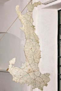 Di Luciano Fabro abbiamo L’Italia fascista: una carta geografica politica del tempo del fascismo, che, ritagliata nella sagoma dello stivale, è appesa al contrario a un cappio.