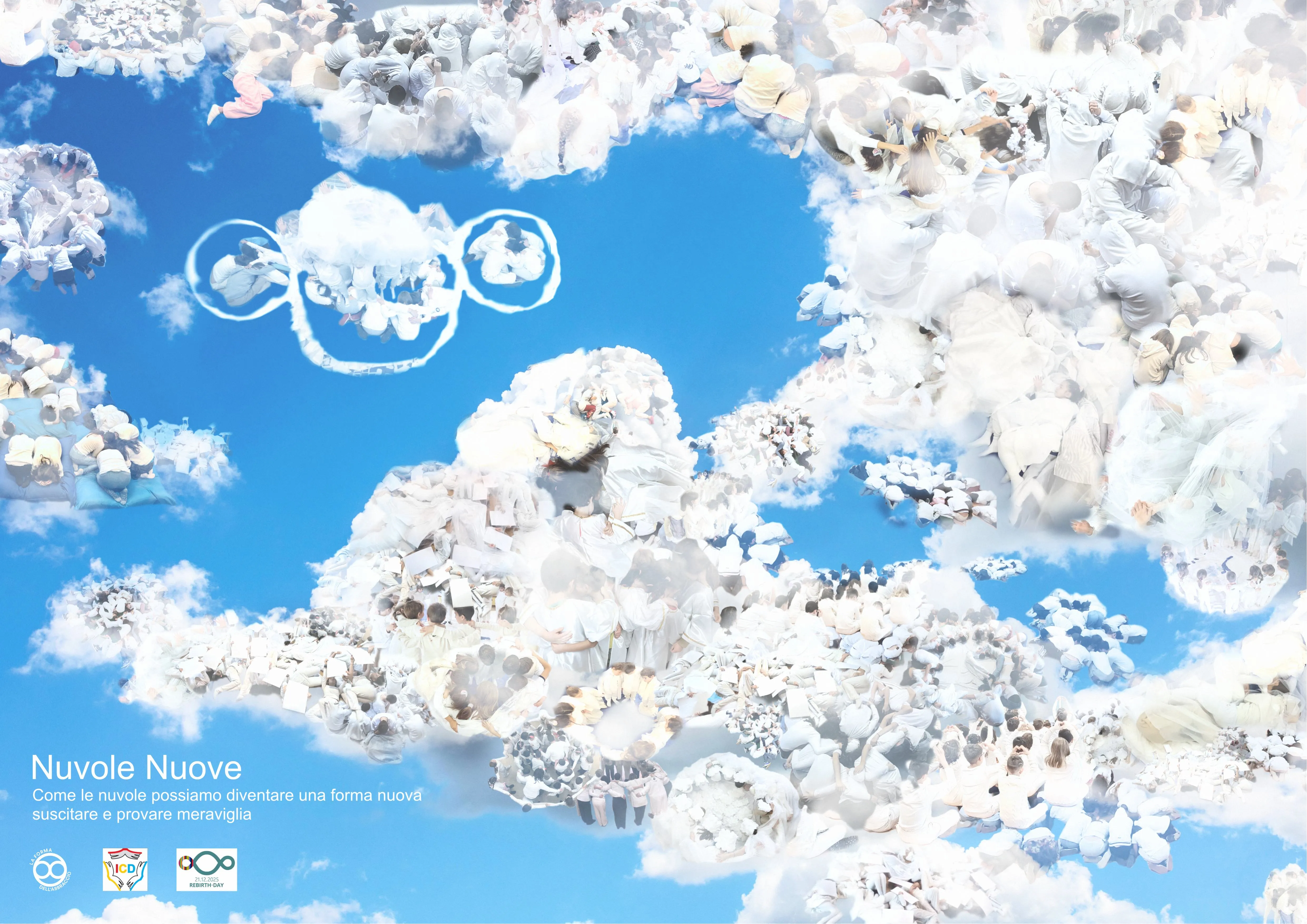 Circa 400 studenti dai 5 ai 13 anni si sono trasformati, indossando il colore bianco per richiamare la purezza, l’innocenza, la luminosità, la pace interiore e la pace globale. Si sono avvicinati e hanno cercato un contatto realizzando la Forma dell’Abbraccio e tanti abbracci e dimensioni nuove. Le foto e gli scatti realizzati sono stati collegati e rielaborati per comporre un poster raffigurante un cielo ricco di forme in divenire, abitato da nuvole libere.
