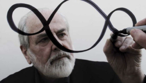 Seconda immagine: Michelangelo Pistoletto traccia il Terzo Paradiso sullo specchio. Foto di Juan Sandoval, 2010.