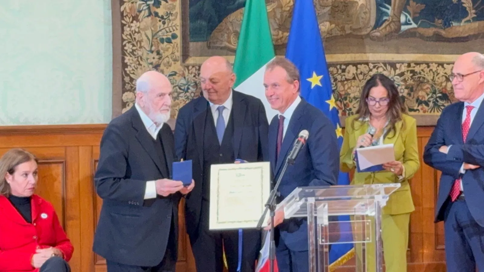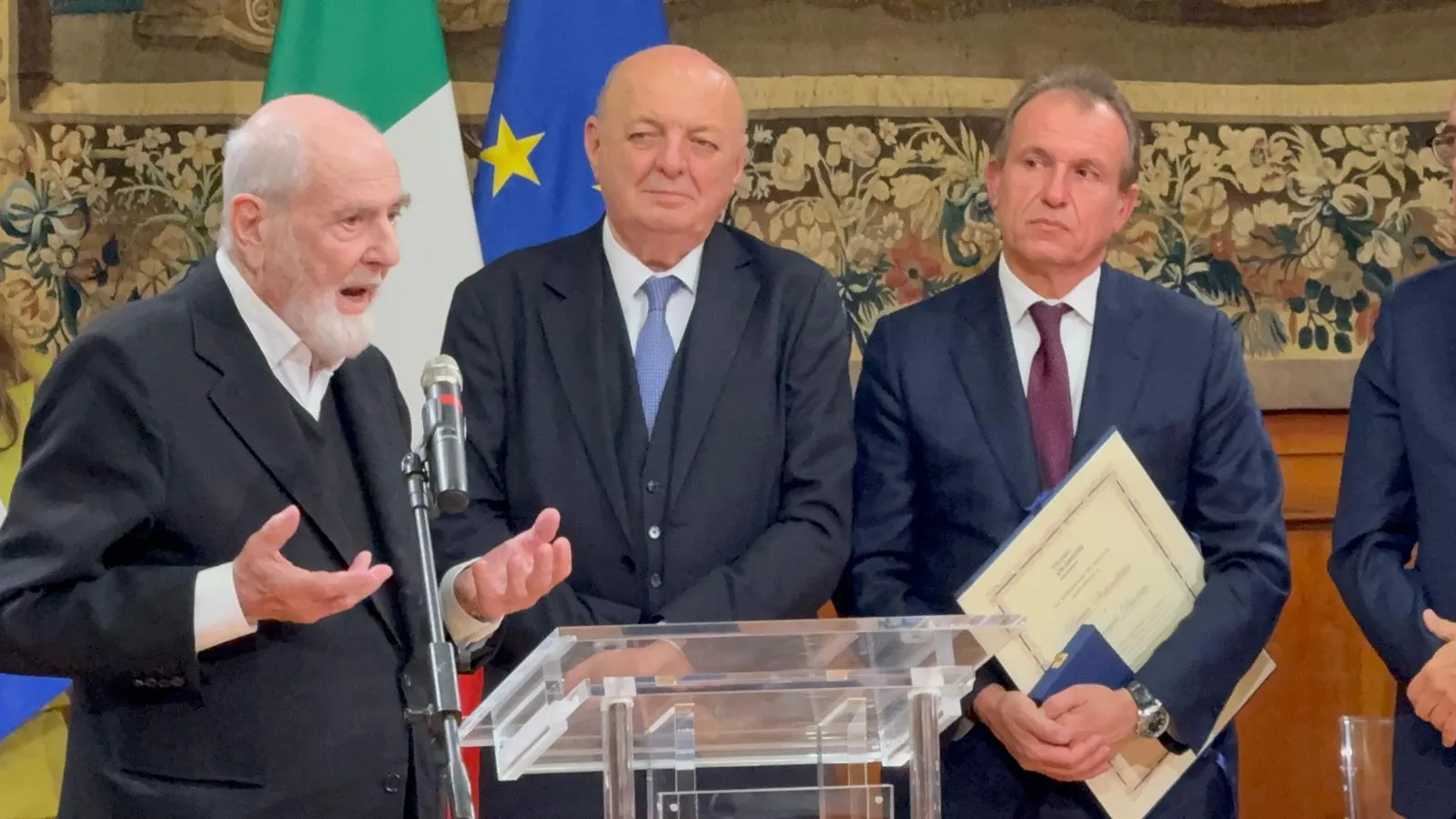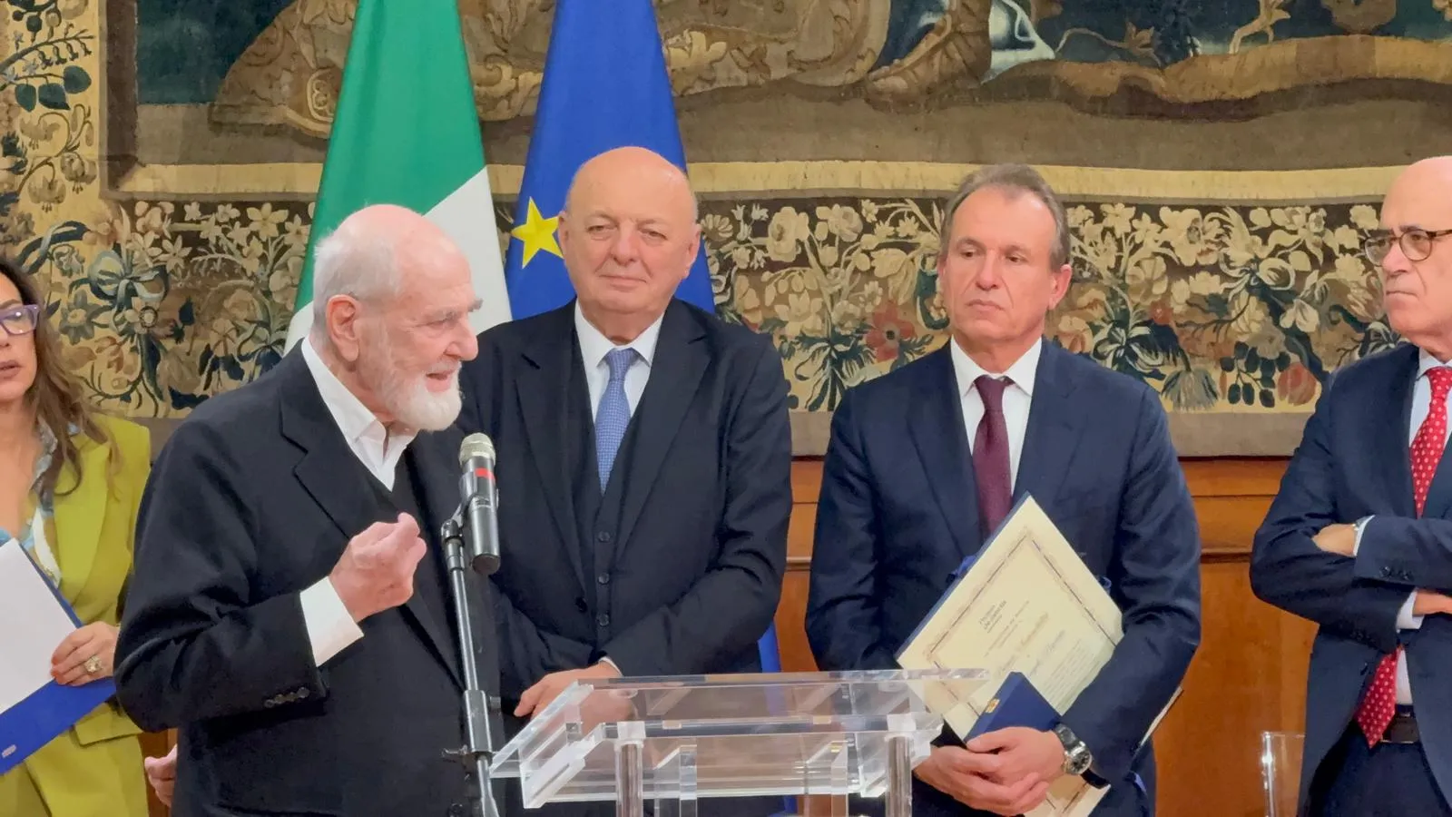 Di grande rilievo anche l’intervento di Gianni Letta, Presidente del Premio, che ha voluto sottolineare l’importanza della visione spirituale e umanistica del lavoro di Pistoletto, collegandola alla grande retrospettiva UR-RA – Unity of Religions – Responsibility of Art. Letta ha dichiarato: "Ringrazio il maestro, qui presente questa sera, dopo l’apertura nella Villa Reale di Monza di una meravigliosa mostra antologica delle sue opere. In UR-RA, curata da Francesco Monico, già Direttore generale dell'Accademia Unidee, potrete vedere non solo il suo lavoro ma il suo grande significato spirituale: il legame con il cardinale Ravasi, con il 'libro grande del creato', con l’Apologo, mette in relazione arte e religione come grandi forze dello spirito, quelle che, ricordava proprio Francesco De Sanctis, muovono il mondo. Monico, presentando la mostra, scrive che abbiamo voluto portare nel presente una riflessione antica: così come all’origine l’arte ha dato forma allo spirituale, ancora oggi può essere ponte tra le differenze, luogo di confronto e dialogo, arte come radice di umanità, come responsabilità, come promessa di un pensiero condiviso e dialogante. Solo questa è la condizione perché ci sia futuro".
