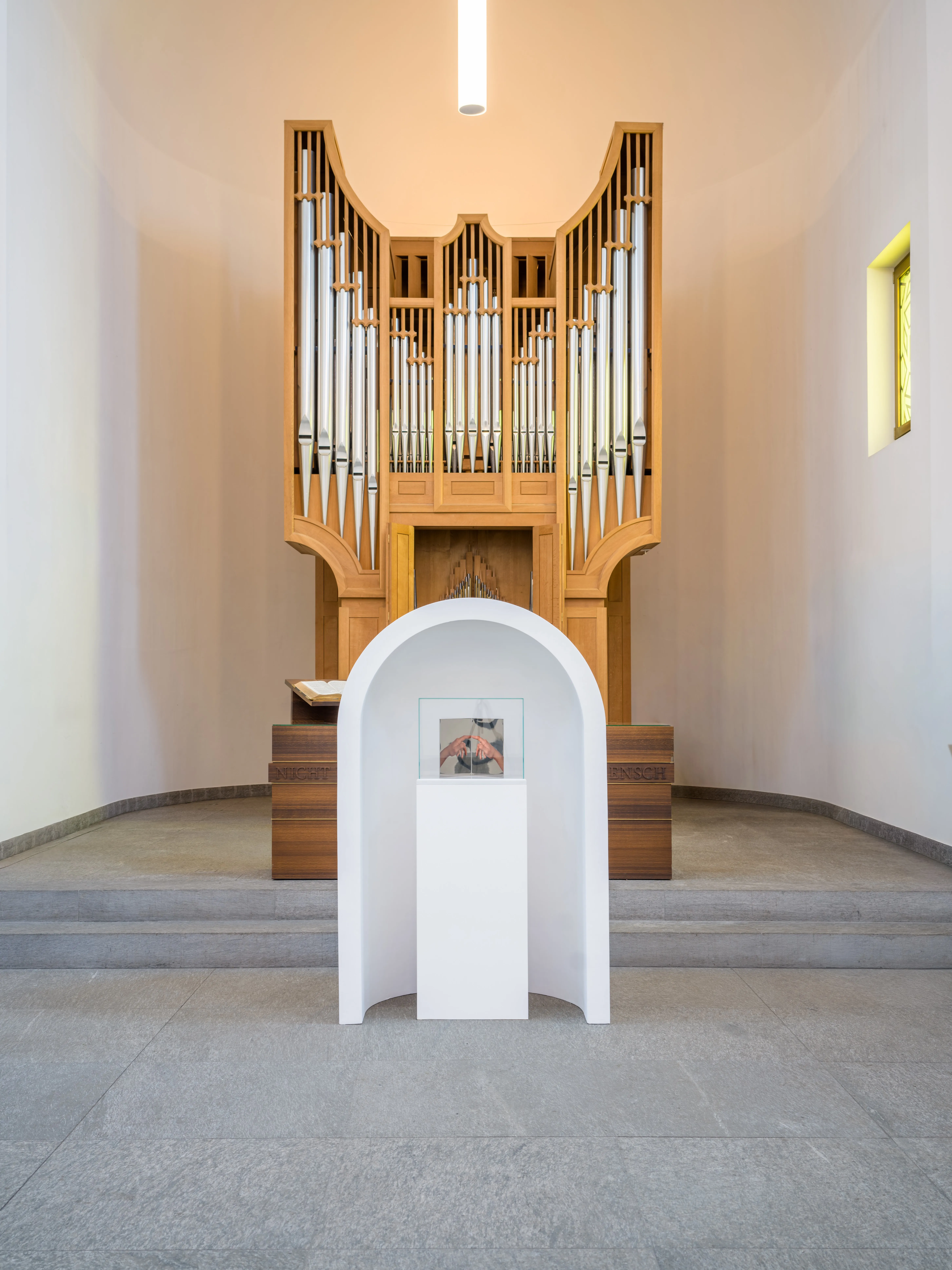 In prossimità dell’altare è installata conTatto (2017), una serigrafia su acciaio specchiante di dimensioni contenute. L’opera è composta da due superfici angolate che generano riflessi incrociati e coinvolgono direttamente lo spettatore. La sua collocazione nell’area presbiteriale stabilisce un confronto diretto con il luogo, senza alterarne l’impianto, ma introducendo un punto di osservazione ravvicinato e concentrato.