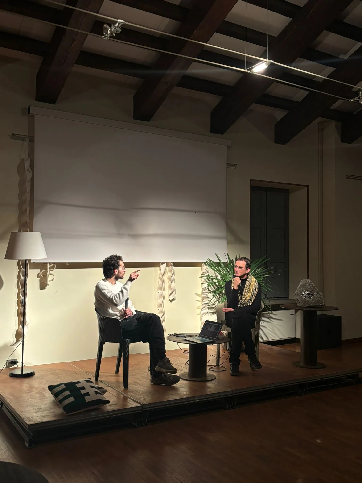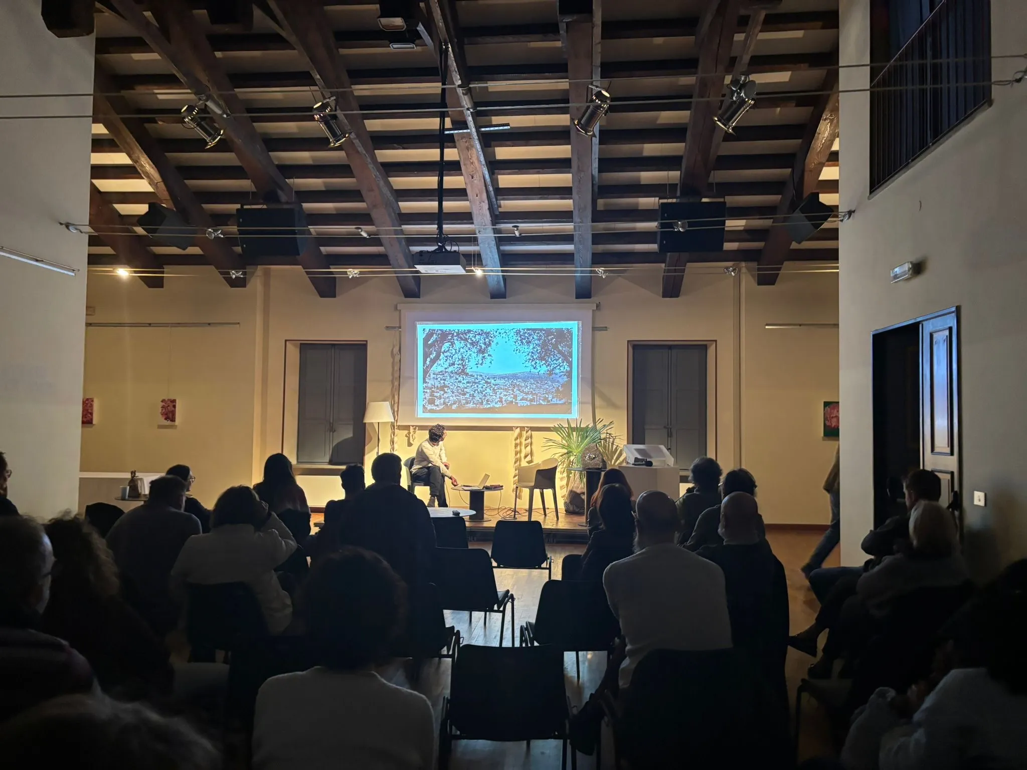 La serata si è conclusa con la presentazione della ricerca artistica di Izz Aljabari, giovane artista palestinese originario di Hebron e residente a Cittadellarte grazie alla collaborazione tra Fondazione Pistoletto e Qattan Foundation. Tradotto da Naldini, Aljabari ha raccontato la propria storia personale e illustrato la sua pratica artistica, incentrata sulla relazione tra memoria, suolo, ferite collettive e forme di controllo coloniale. Le sue installazioni - composte di pietra, polvere, vetro e specchi - agiscono come dispositivi sensibili, capaci di trasformare gli archivi in luoghi vivi, aperti e vulnerabili. Nella sua ricerca a UNIDEE Residency Programs Aljabari sta infatti approfondendo il rapporto tra memoria locale e algoritmi di sorveglianza: "L’intelligenza artificiale tenta di tradurre la vita palestinese in dati. Io faccio il contrario: cerco di restituire alla materia il suo valore umano e poetico". Un intervento che ha ampliato ulteriormente il contesto del romanzo, riportando l’attenzione dal piano simbolico a quello politico e storico.