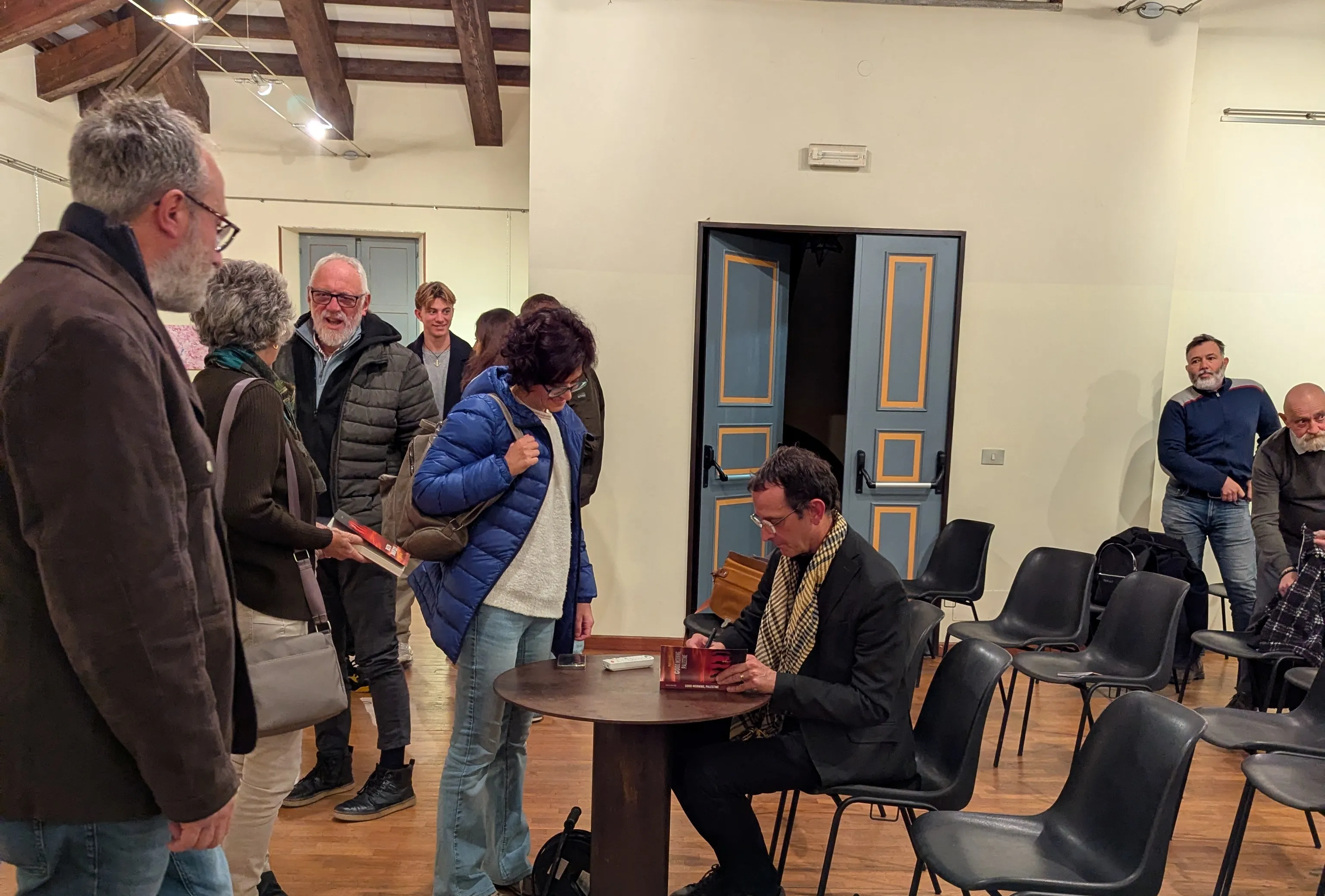 A fine serata - tra firmacopie, rinfresco e conversazioni informali - l'impressione era che l’evento avesse superato i confini del semplice lancio editoriale. Good Morning, Palestine non è stato solo raccontato: è stato messo in relazione con chi cammina, con chi resiste, con chi crea. Il libro di Naldini, le parole di Lanza, la voce di Aljabari: tre direzioni diverse che hanno tracciato un’unica mappa, una mappa che non indica luoghi ma possibilità. Quando la sala si è svuotata, a Villa Piazzo è rimasto qualcosa di invisibile ma persistente, ovvero la sensazione che ogni storia possa avvicinare ciò che sembra lontano, e che ogni gesto, anche il più piccolo, possa incrinare l’indifferenza. Ecco perché la serata non si è davvero conclusa: ha inaugurato un percorso. Un cammino che, come quello di Sebastiano, resta aperto a chiunque voglia unirsi a lui.