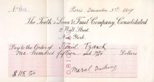 Partendo dal "Tzank Cheque", il facsimile di assegno da 115 dollari datato 3 dicembre 1919, disegnato e firmato per pagare il suo dentista, Marcel Duchamp esplora il rapporto tra arte ed economia*, essendo il suo "Tzank Cheque" allo stesso tempo metodo di pagamento e opera d'arte. Duchamp sfida provocatoriamente la rispettiva sfera dei domini artistici ed economici con un'interpretazione speculativa del "valore", che rivela le loro preoccupazioni sociali e simboliche condivise*. Cos'è il "valore" nell'arte e nell'economia? Un parallelo può essere fatto tra l'originalità di un ready – made di Marcel Duchamp e la circolazione della valuta, essendo entrambe le cose basate e garantite attraverso una "firma": una banconota sarebbe un semplice pezzo di carta senza la firma di un tesoriere o di un governatore di una banca centrale così come "Fountain" sarebbe un semplice orinatoio senza l'idea e la firma dell'artista* (seppur con lo pseudonimo di "R. Mutt 1917", essendo Richard Mutt un personaggio dei fumetti a dimostrazione dell'ironia unica di Duchamp).