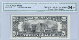 Sfortunatamente, per non dire genialmente, ad un certo momento JSG Boggs inizia a stampare il suo denaro disegnato sulla stessa carta utilizzata dal Bureau of Engraving and Printing del Dipartimento del Tesoro degli Stati Uniti (e istituzioni simili nel Regno Unito, in Australia, in Svizzera e in altri paesi), venendo così arrestato per contraffazione con confisca delle sue opere d'arte. Boggs ha risposto che nel definirlo un contraffattore, "non capiscono la differenza tra arte e crimine".
